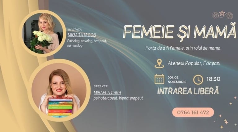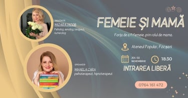 "Forța de a fi femeie, prin rolul de mamă" - Focsani, Ateneul popular Maior Gh. Pastia - noiembrie 2023 - organizator eveniment si speaker - eveniment live
