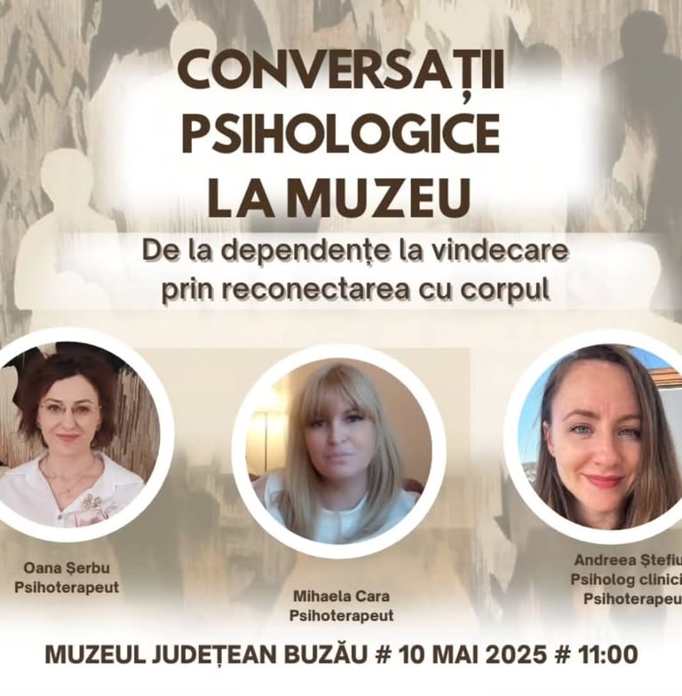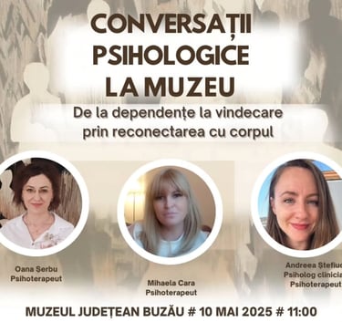 "Conversații psihologice la muzeu - De la dependențe, la vindecare, prin relația cu corpul" - Buzău - 10 mai 2025 - invitat speaker - eveniment live
